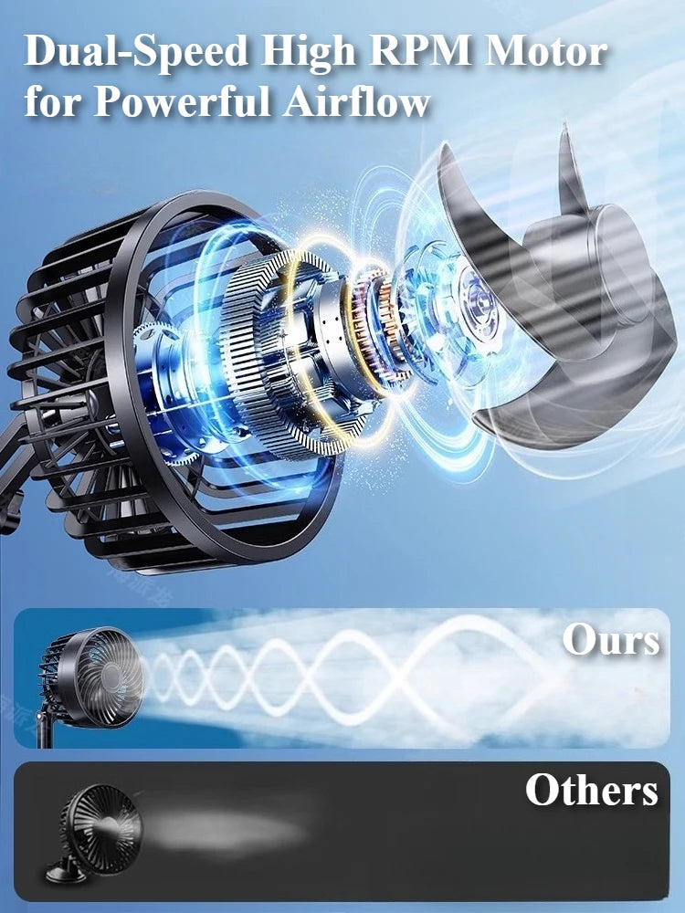 3. **Compact & Portable Design** – Lightweight and easy to install, this fan fits perfectly in tight spaces like cup holders, dashboards, or mounted on surfaces.