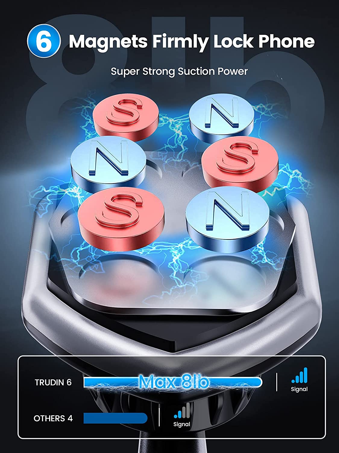 100% Full SignalThe Trudin Magnetic car phone holder adopts proper magnet, which cause no effect to your signal.It use 6 N48 magnets with strong and proper magnetic force instead of those overload or weak magnets. It will bring you full signal during driving. (Notes: Do not use it to contact any credit cards) |