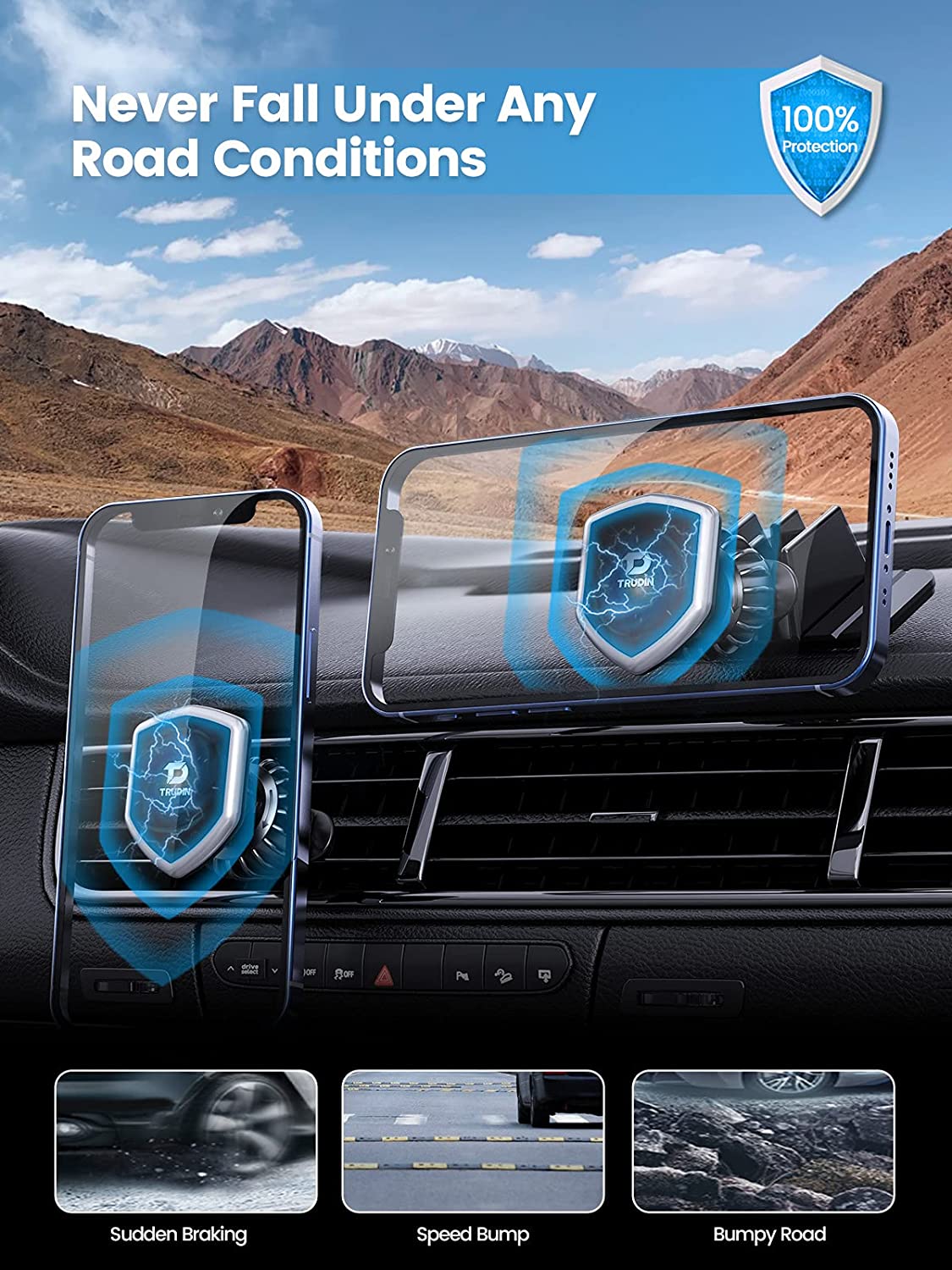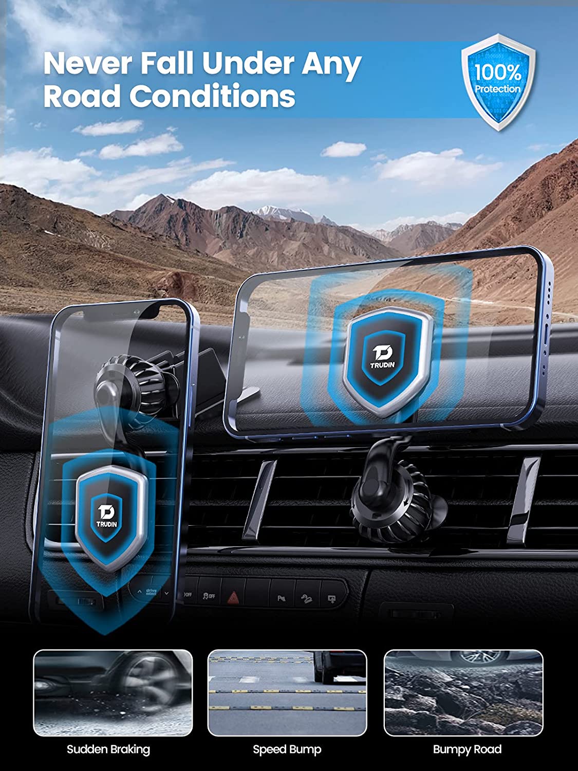 100% Stable "Hook"This Trudin magnetic phone holder for car vises the outlet blades tightly and ensure it never fall off in any situation, forming a ultra stable triangle points. The intelligent design solve the market’s common problem of being easy to fall off over time. |