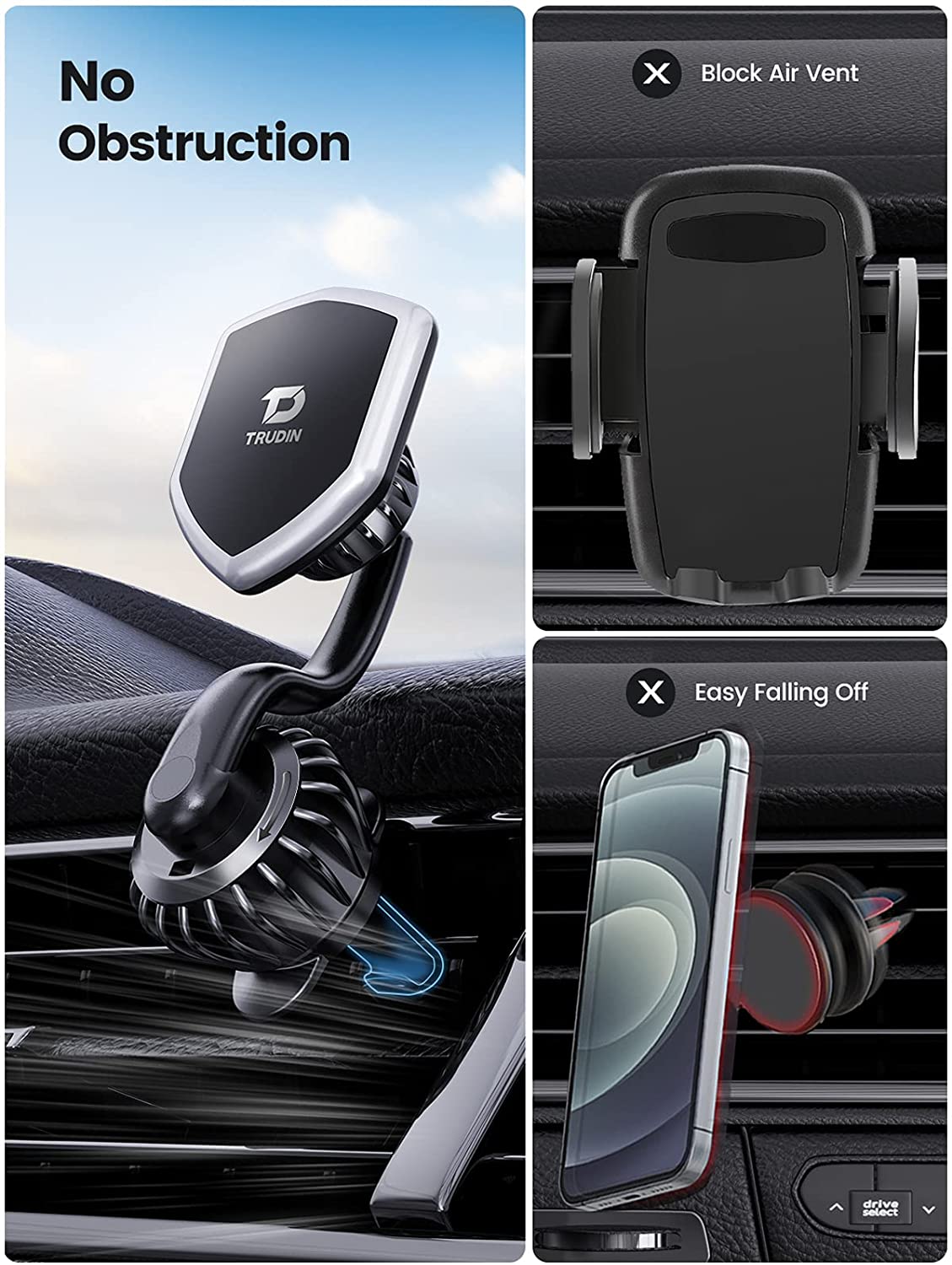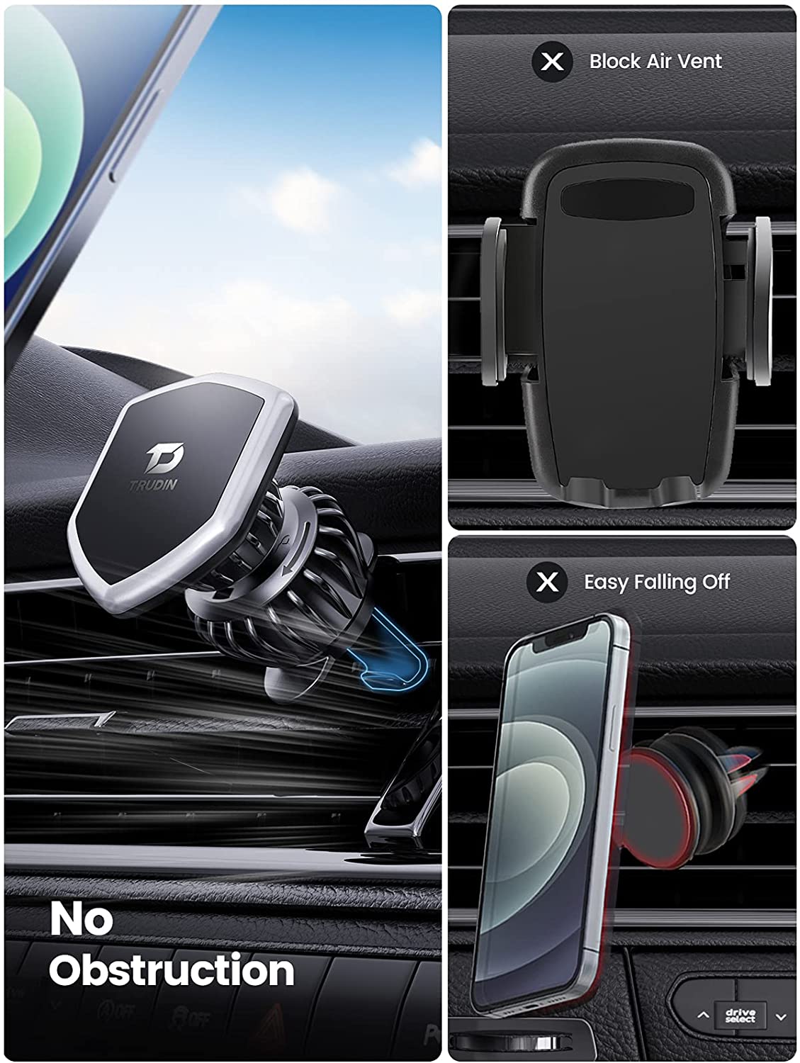 No obstructionThis Trudin magnetic phone holder adopts smart and flexible design, without blocking any view and air conditioner. |
