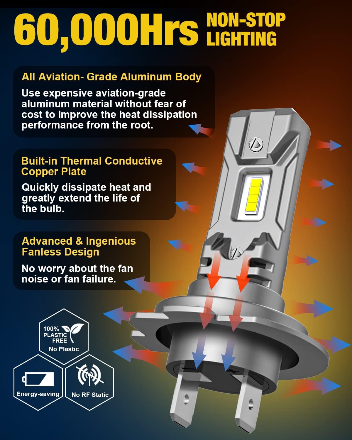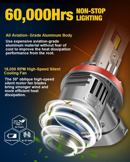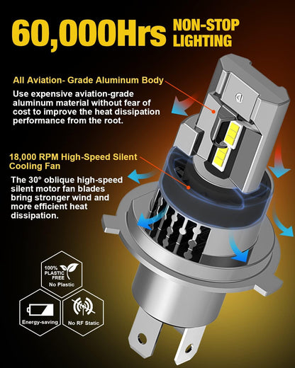 【60,000Hr Non-Stop Lighting】With Top-graded aviation aluminum material, dual copper substrates, and 18000RPM silent turbofan help to dissipate the heat generated from the LED chips rapidly and effectively. The H4 LED will operate in a normal working temp range and produce continuous lighting of about 60,000Hr hours of lifespan without damage shortly, freeing you from the trouble of frequent replacements.